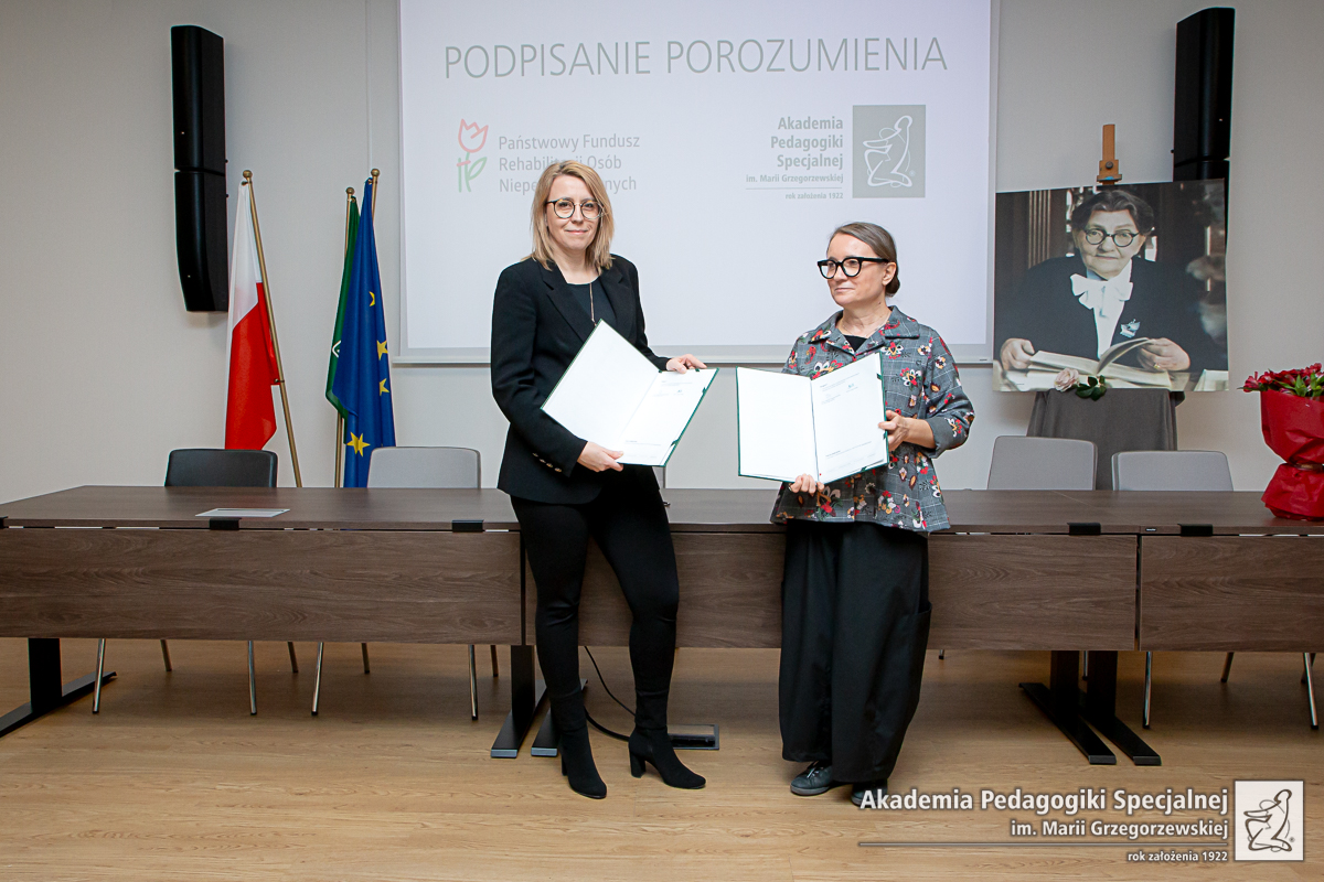 Akademia Pedagogiki Specjalnej im. Marii Grzegorzewskiej oraz Państwowy Fundusz Rehabilitacji Osób Niepełnosprawnych podpisały porozumienie o współpracy, którego celem jest rozwój wspólnych działań w zakresie dostępności i włączenia społecznego. Porozumienie zostało podpisane przez dr hab. Barbarę Marcinkowską, prof. APS - Rektor Uczelni oraz Małgorzatę Lorek, Prezes Zarządu PFRON.