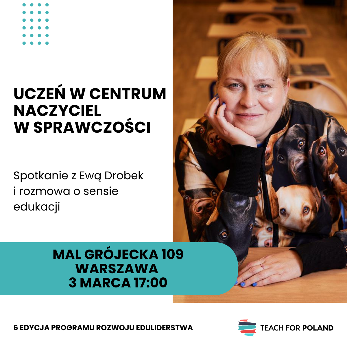 Prorektor ds. Kształcenia, dr hab. Agnieszka Olechowska wraz z Fundacją Teach for Poland, Dyrektor Instytutu Wspomagania Rozwoju Człowieka i Edukacji dr Agnieszką Pawlak oraz przedstawicielką IWRCiE do spraw współpracy z Fundacją TfP dr Agnieszką Gąstoł serdecznie zapraszają i zachęcają do wzięcia udziału w wyjątkowym spotkaniu z panią EWĄ DROBEK, nauczycielką, która jako pierwsza Polka znalazła się w czołowej 10 prestiżowego konkursu Global Teacher Prize!