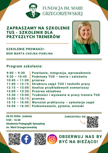Serdecznie zapraszamy na szkolenie: TUS - szkolenie dla przyszłych trenerów, które poprowadzi mgr Marta Chojka-Pawlina